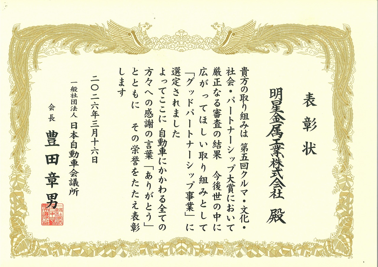 2026年3月17日 / 最終更新日時 : 2026年3月18日 MeiseiSU ニュース 3/16 第5回クルマ・文化・社会・パートナーシップ大賞「グッドパートナーシップ事業」を受賞しました 3/16 一般社団法人「日本自動車会議所」様より明星金属工業の様々な取り組みに対して『第5回クルマ・文化・社会・パートナーシップ大賞「グッドパートナーシップ事業」』を受賞しました。 共有: X で共有 (新しいウィンドウで開きます) X Facebook で共有 (新しいウィンドウで開きます) Facebook いいね:いいね 読み込み中… 関連